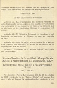Nacionalizacion de la entidad Compania de Mieles y Combustibles de Cienfuegos S. A.27/01/2026 Por Almar Deja un comentarioNacionalización de la entidad Compañía de Mieles y Combustibles de Cienfuegos, S. A.”. Leyes del Gobierno Revolucionario de Cuba. XXXIX, 1 a 31 de diciembre de 1961, enero de 1962, pp. 221-224